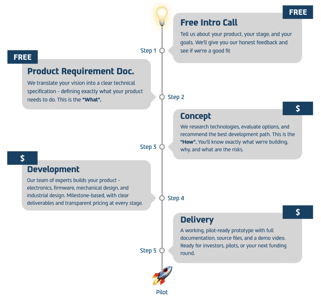 Three clear paths to turn your hardware idea into a real product. No hidden costs. No endless scope creep.